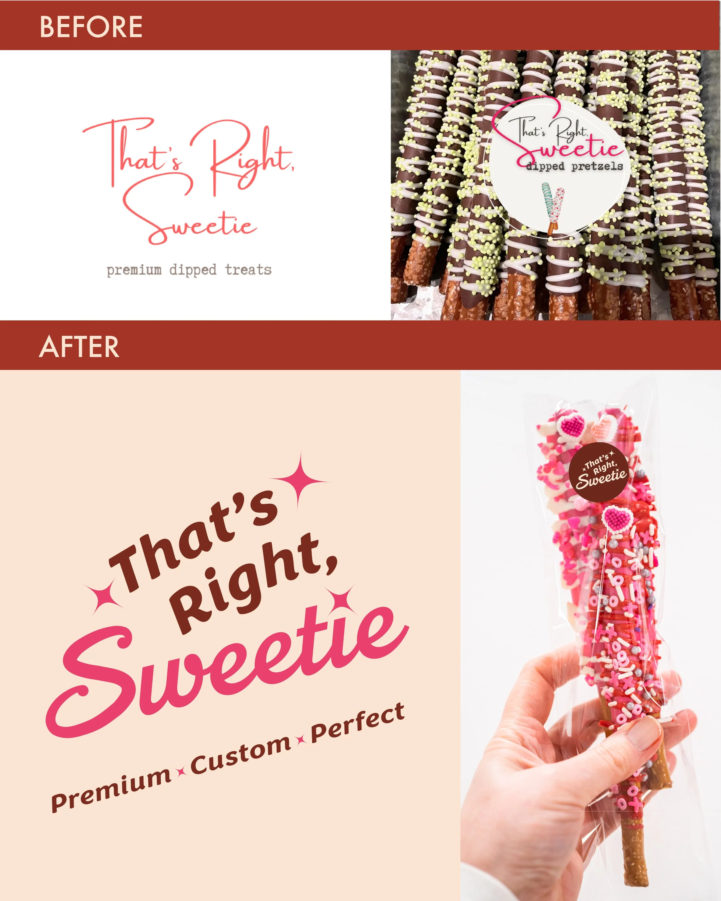 When That's Right, Sweetie approached us, their original logo wasn't living up to their premium product experience. The delicate script font, while elegant in theory, created significant functional problems: stroke weights were too light for reproduction, extreme size contrast between capitals and lowercase made readability nearly impossible at their critical 1" sticker size—the signature touch on every individual confection. Multiple inconsistent logo variations had proliferated across applications, diluting brand recognition and creating visual chaos.